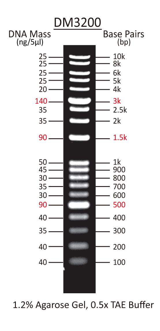 SBDM2300: 100 - 3,000 bp Ready-to-use DNA Ladder with Pre-mixed Loading Dye and sharp bands, 12 Bands, Each