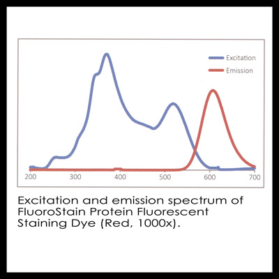 This protein fluorescent staining dye is designed to substitute the common coomassie blue protein staining method. This dye offers a greater sensitivity. The fluorescent staining dye binds to protein with specificity, making destaining process an option. It can achieve detection level parallel to silver staining without specialized imaging equipment. The stained gel can be visualized by both UV light and the blue light. The excitation peaks are around 369 and 517 nm, and the emission at 605 nm.